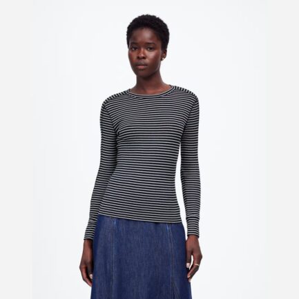 Madewell Côtelée Encolure Ras Du Cou À Manches Longues Pour Femmes T-Shirts En Noir / Blanc