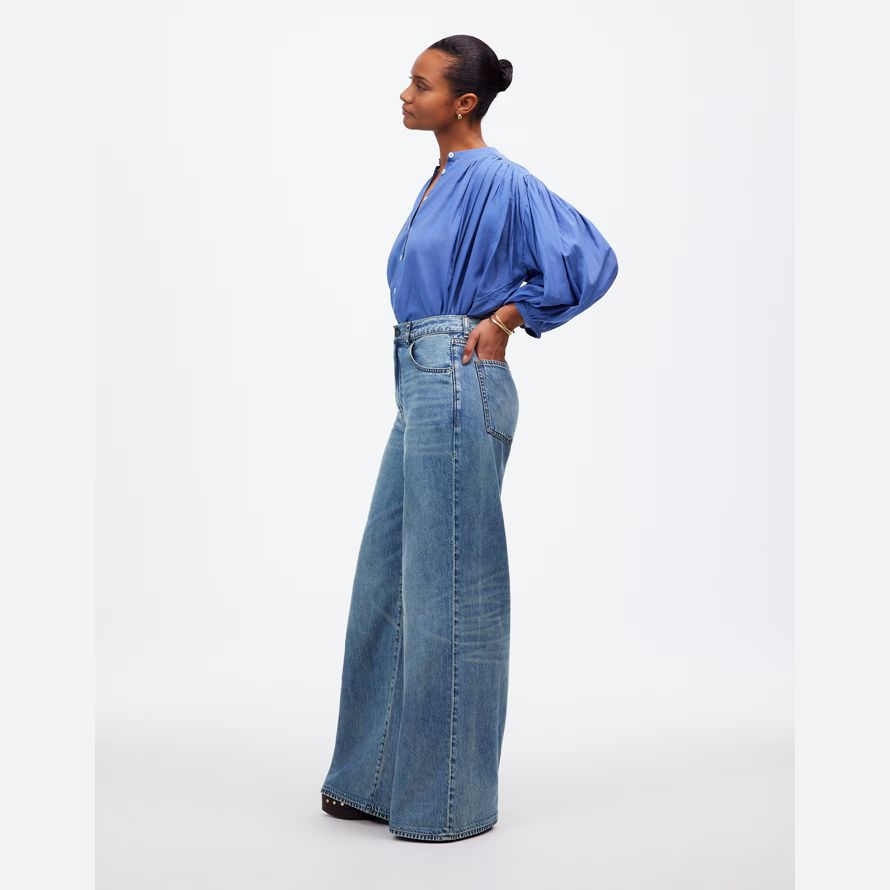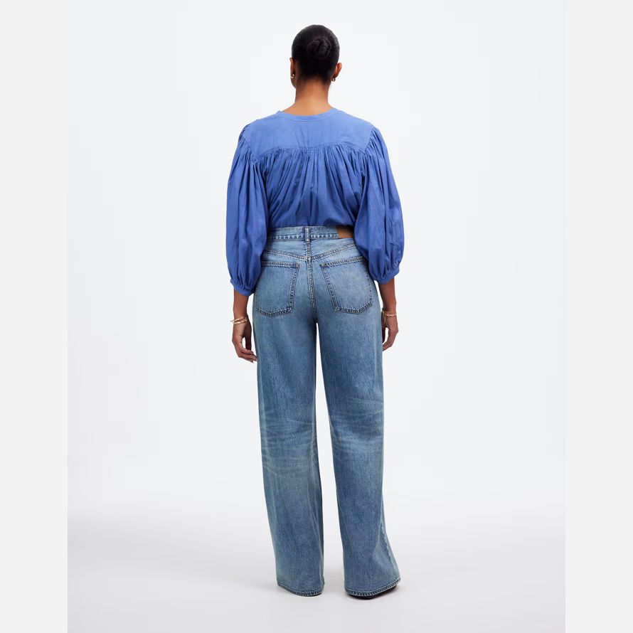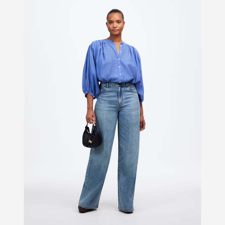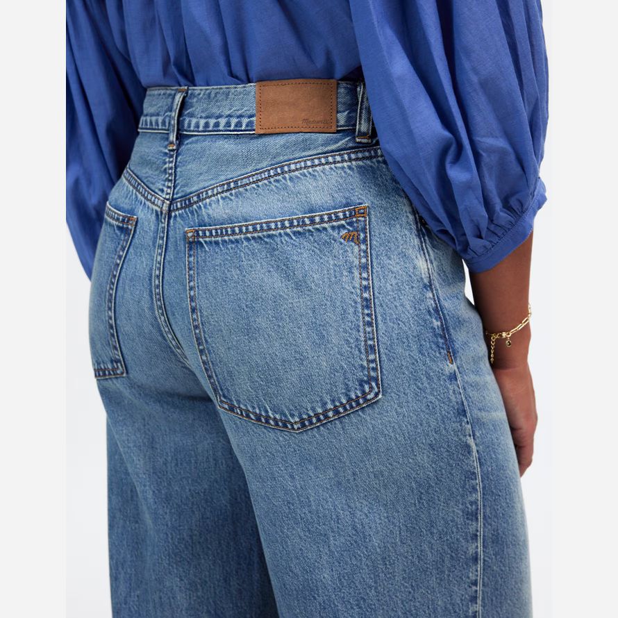 très grand jambe curvy jeans ont une taille haute, avec un profilé en bande, une longue montée (pour un rond butin) et un peu d’espace supplémentaire au niveau des hanches et des cuisses. Dans Billings, notre moyen de lavage qui imite la couleur naturelle des quarts de ans indigo.