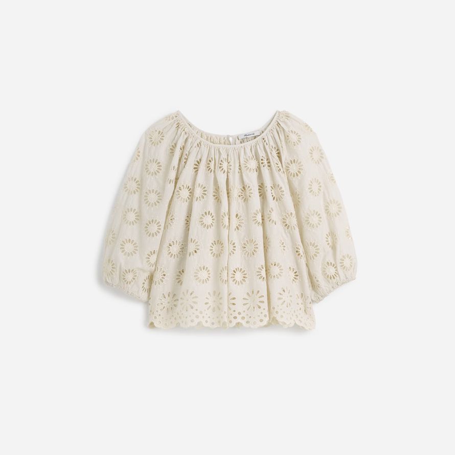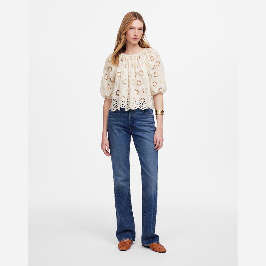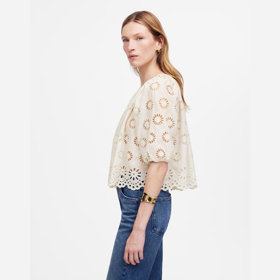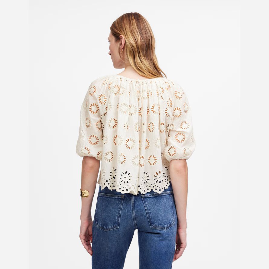 a froncé de l’équipage de l’encolure, manches et un gratin de l’œillet de l’ourlet. Paire avec vos jeans préférés pour une ambiance décontractée.