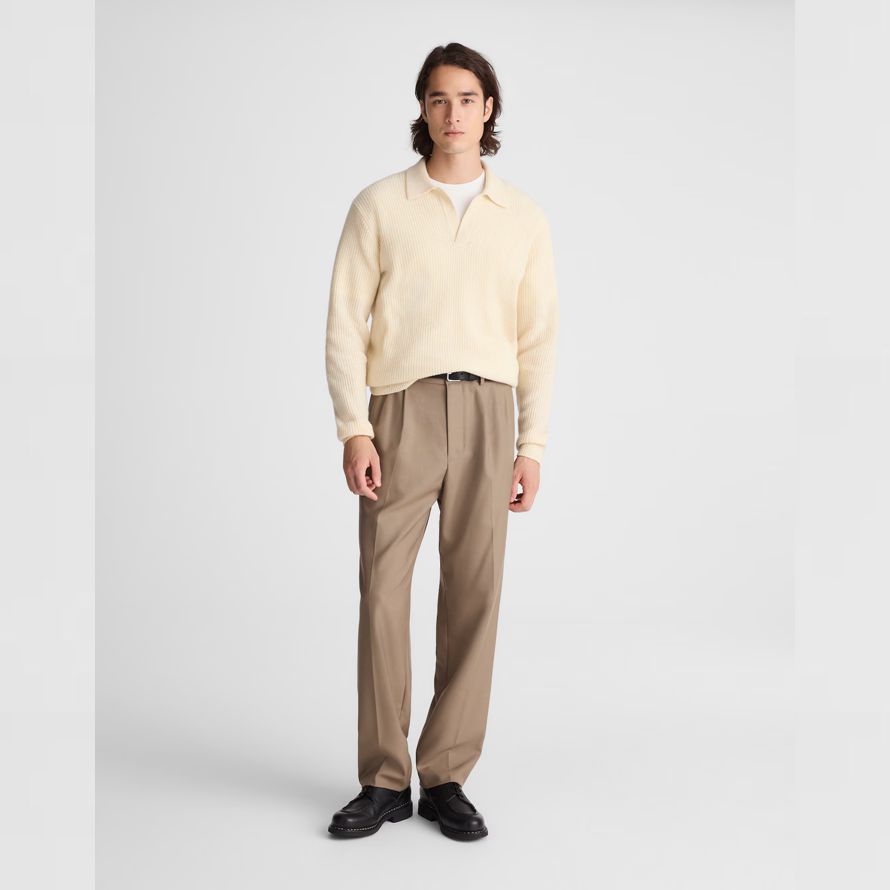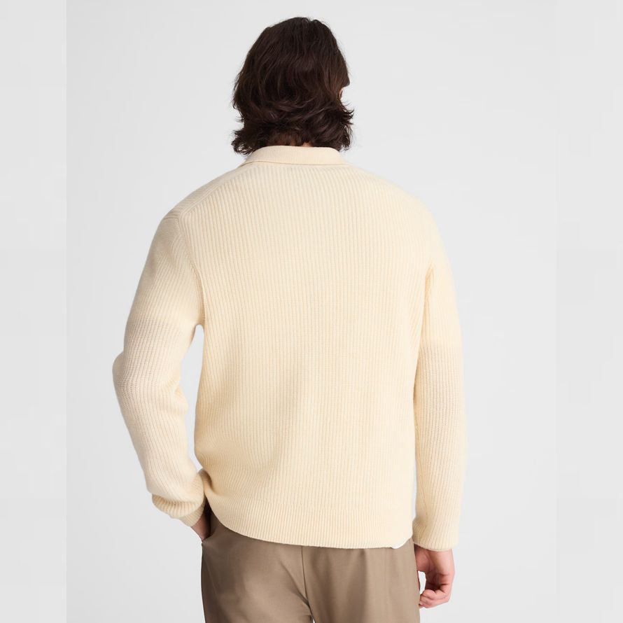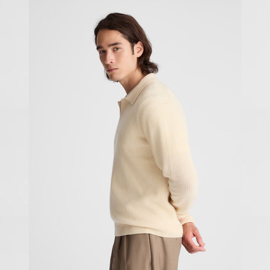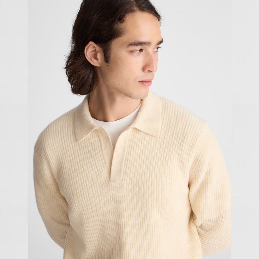 Fait de 100% laine mérinos—AKA un plus fin, plus souple et moins de démangeaisons alternative—ce pull polo dispose d’un Johnny collier et une subtile texture côtelée.