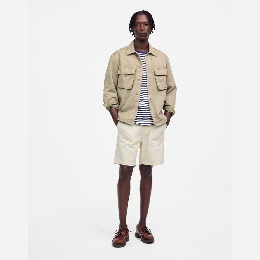 question de la norme pantalon, ces denim shorts disposent de la même rectangulaire poches avant et une plus longue, habillé en hausse.