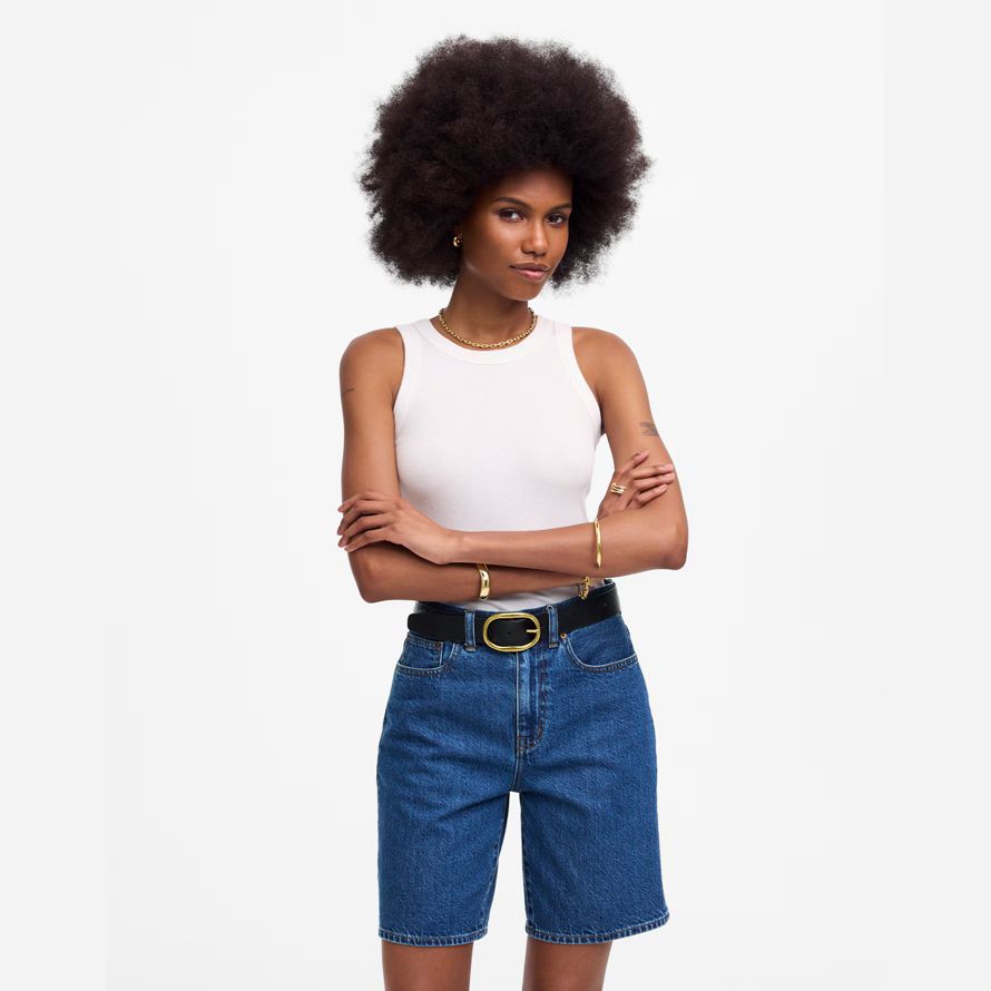 sur le jean court dispose d’une grande hauteur, une forme Une ligne et une longue entrejambe. Conçu avec des pantalons plis pour un look raffinéラrobe avec des talons ou vers le bas avec un réservoir.