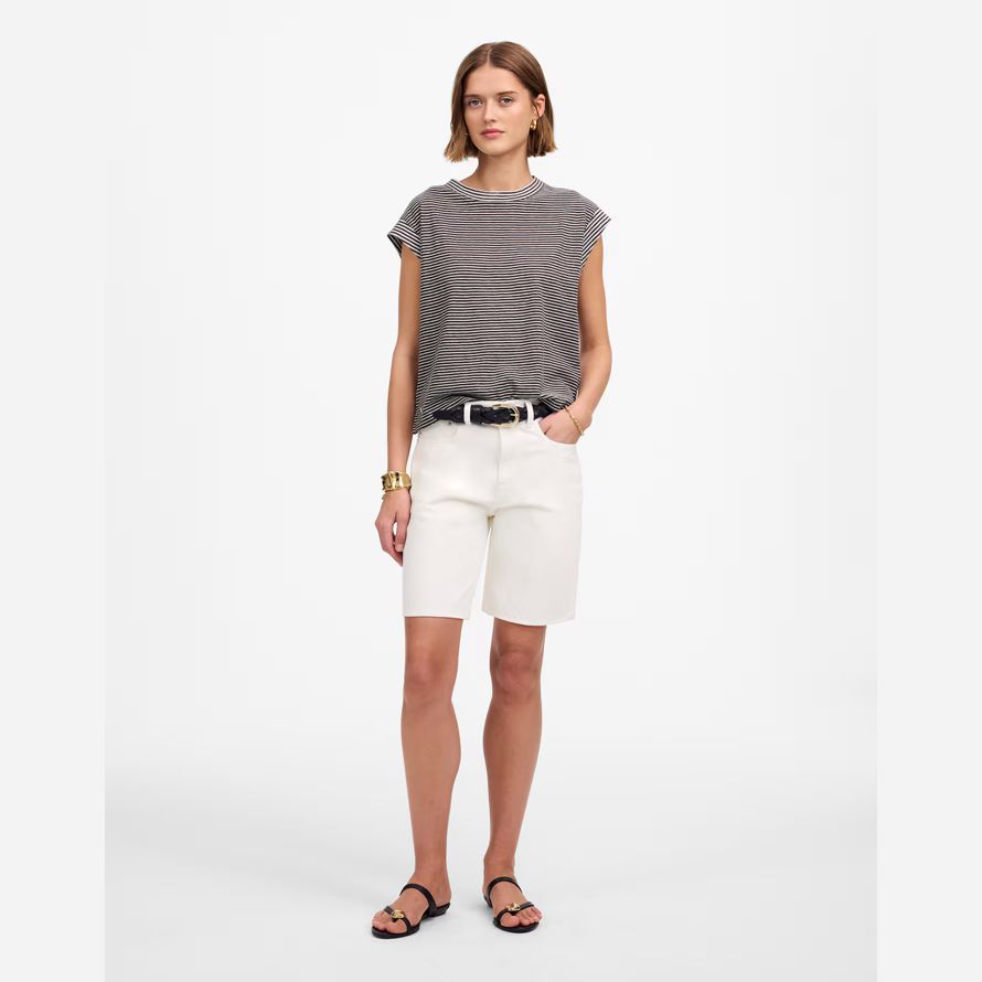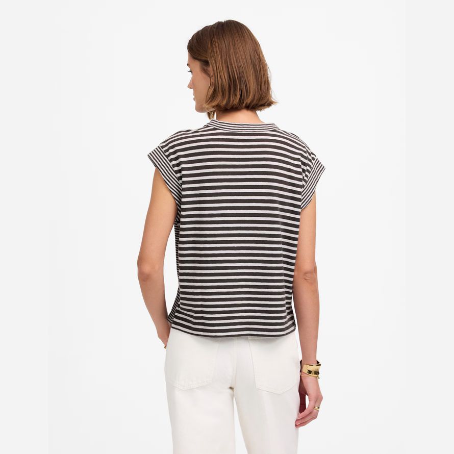 Boxy ajustement.Longueur: conçu pour frapper entre le nombril et le haut de la hanche.La longueur du corps de haut point de l’épaule: 23″.70% coton/30% lin.Laver à la Machine.Importés.