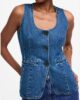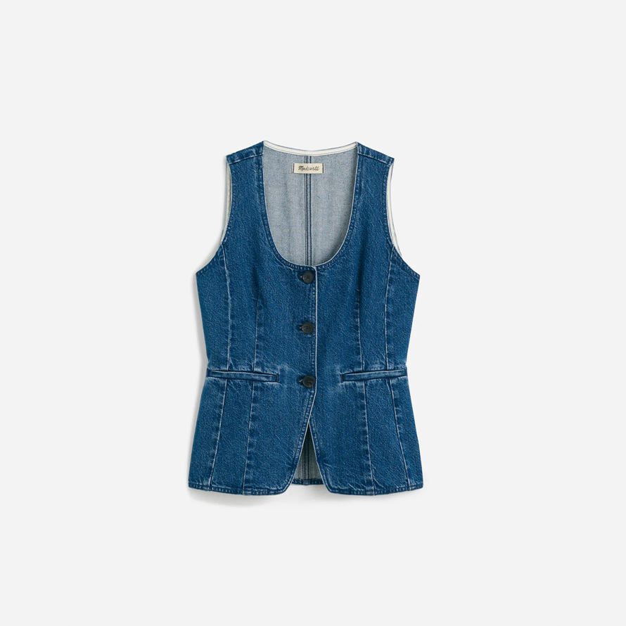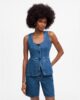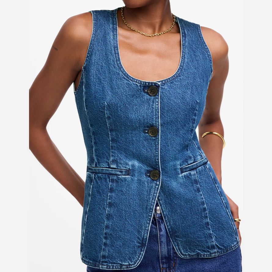 scoopneck, en coupe devant et poches passepoilées pour une touche de polonais. Fini avec authentique denim surpiqûres, en plus de la princesse coutures pour plus de forme.
