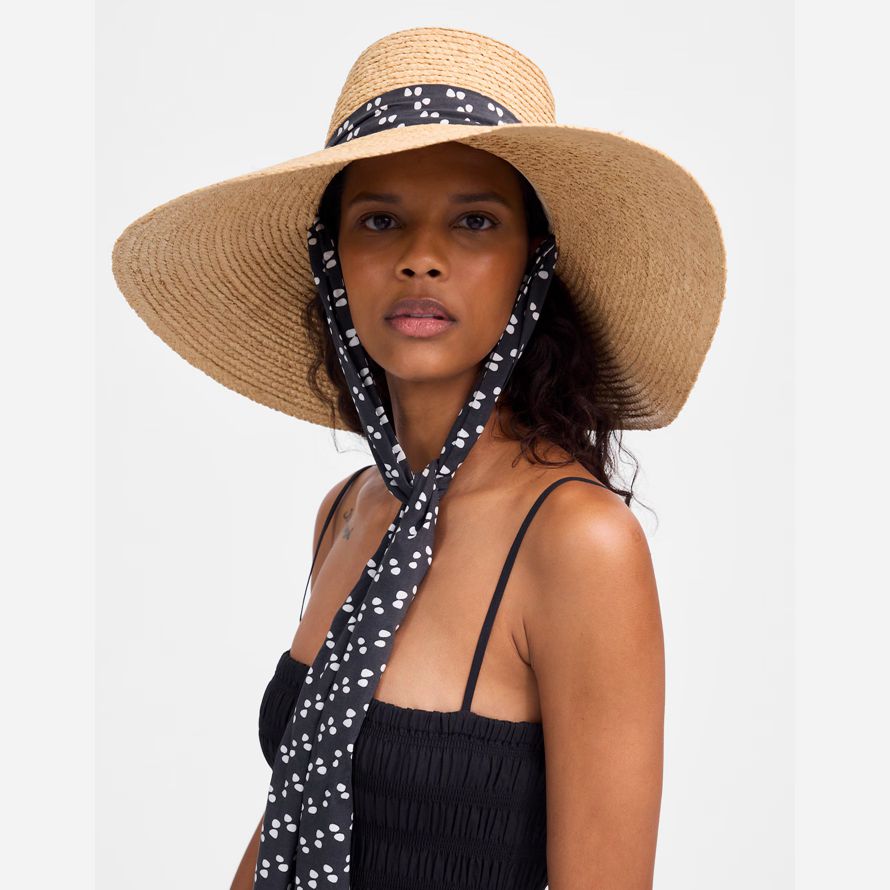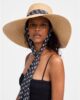 ou autour de la bande avec un foulard en détail. Il est fini avec un large bord pour garder le soleil hors de votre visage.