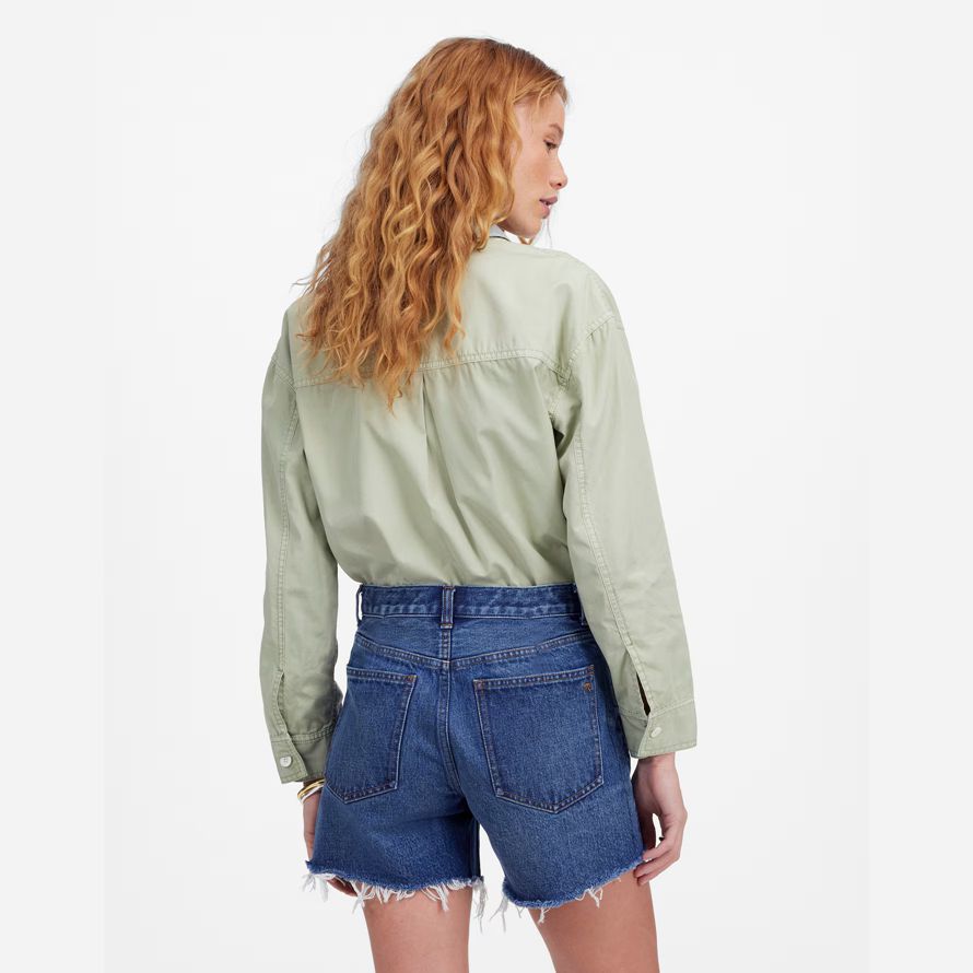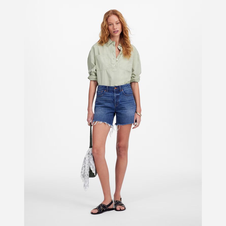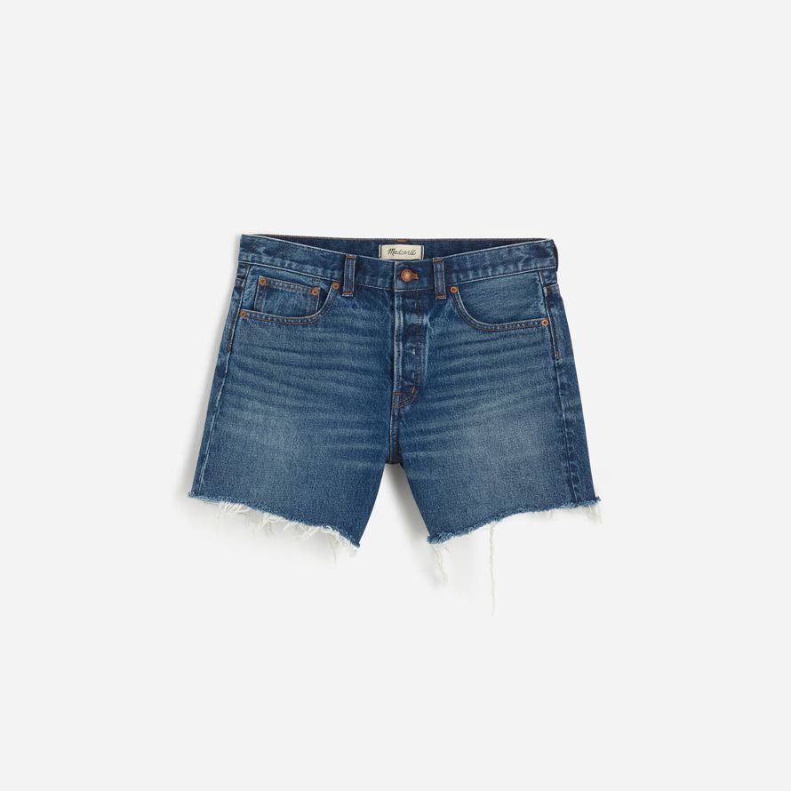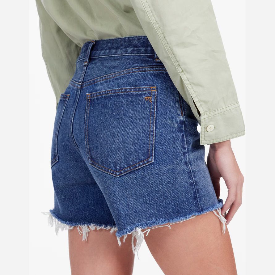 haut-lieu jean shorts disposent d’un mi-longueur de l’entrejambe et de matières de bord de l’ourlet. Également disponible dans un court entrejambe.