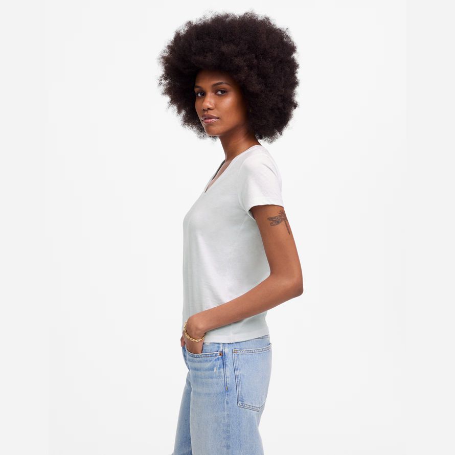 V-neck tee boxy a une forme et est juste à la bonne longueur pour faire rentrer dans des jeans.