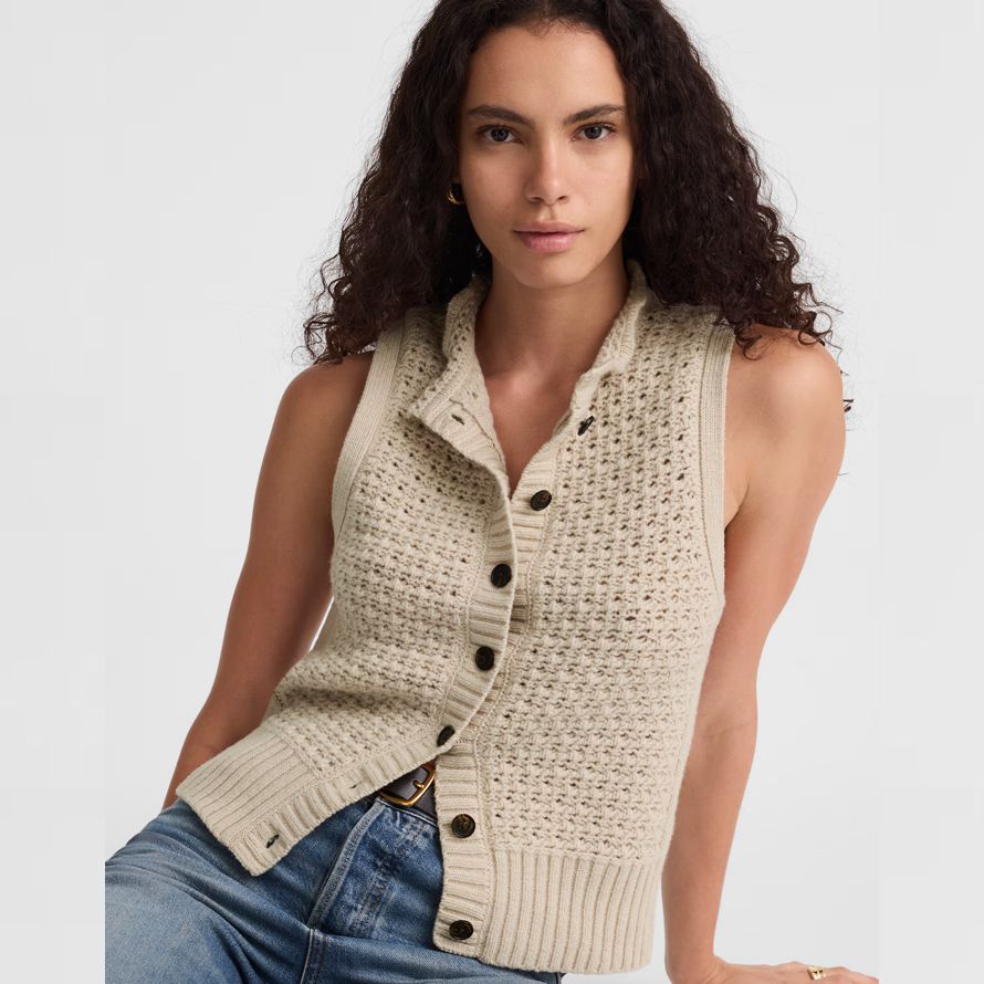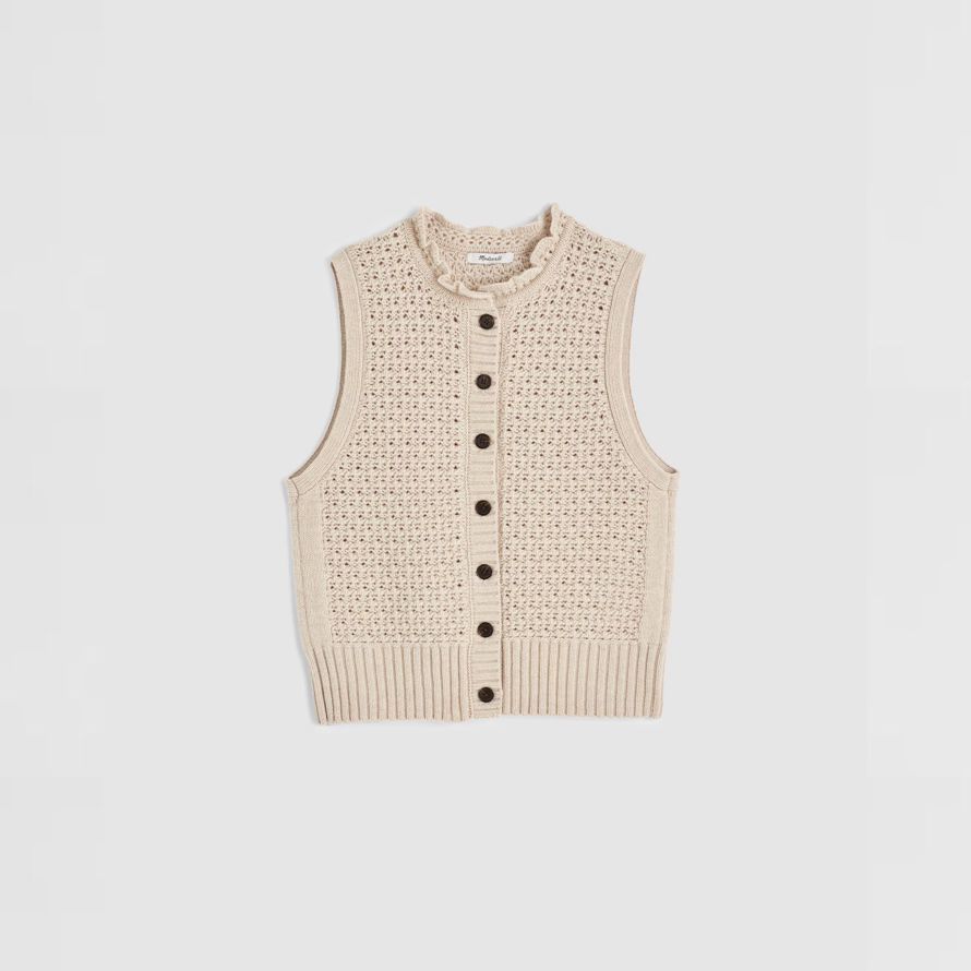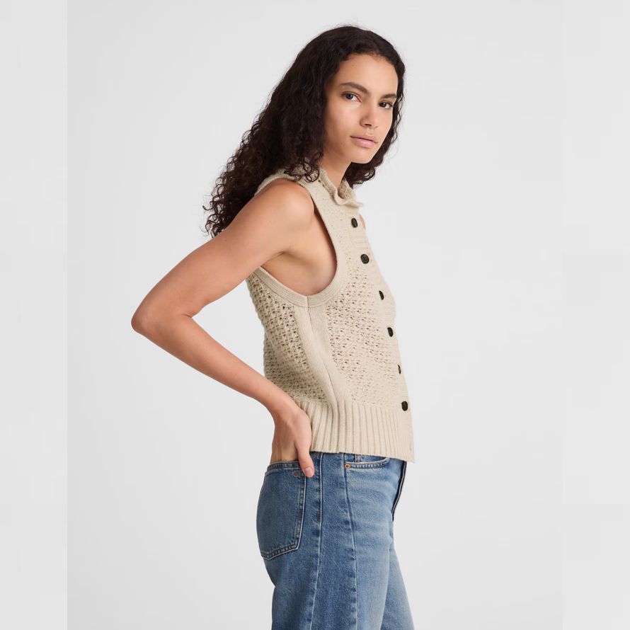 Conçu à partir d’un confortable mérinos mélange de laine, ce cardigan sans manches chandail a une forme mince et dispose de boutons sur le devant. Les volants décolleté ajoute un soupçon de vintage, inspiré d’appel.