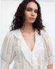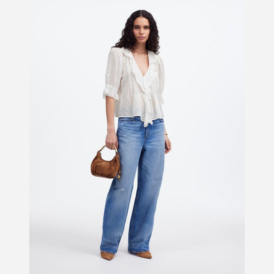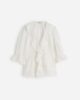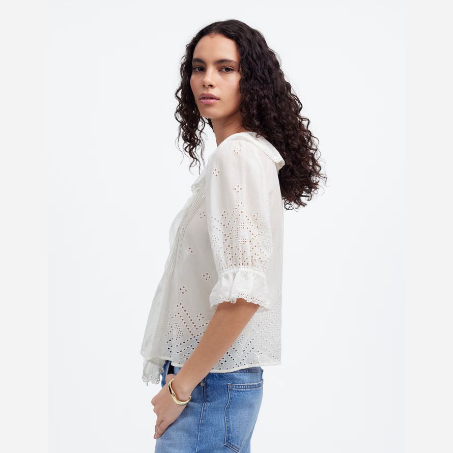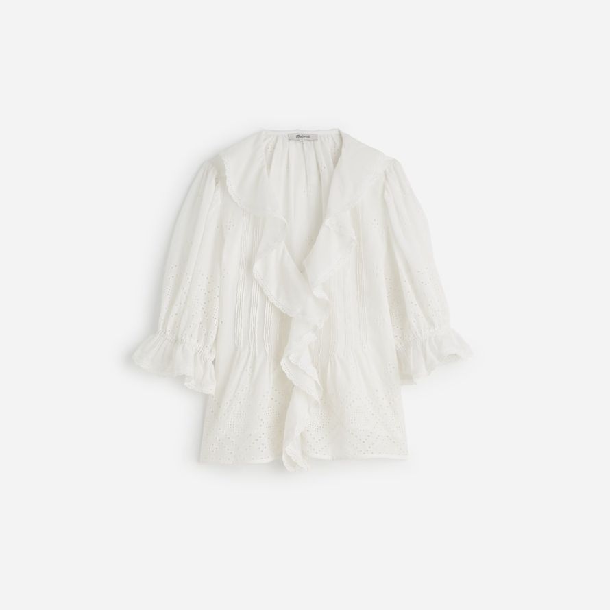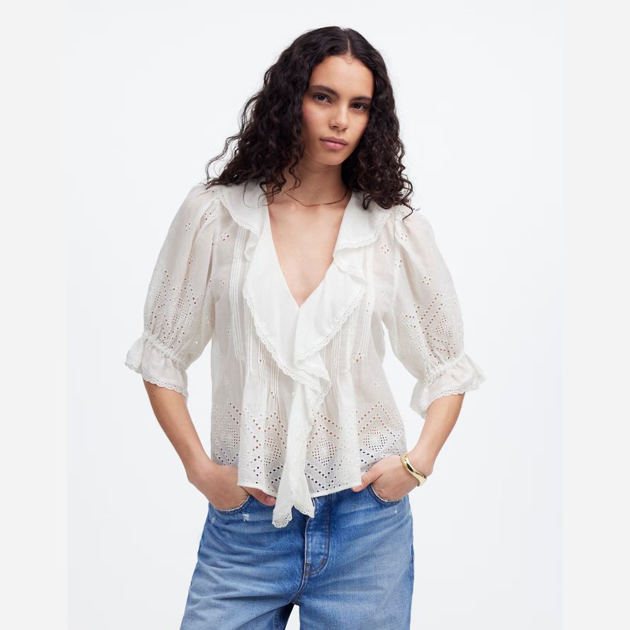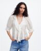 ruffle manches fonctionnalités haut de délicates nervures séparées et de la dentelle de rognage. Parfait pour habiller vos jeans préférés, il ajoute une touche d’effort de charme à votre look quotidien.