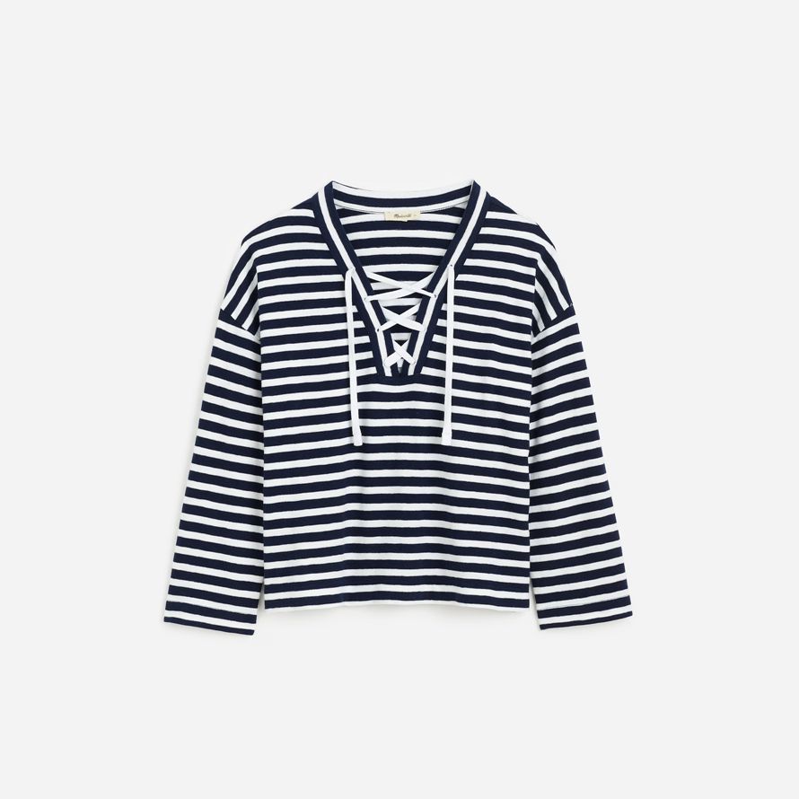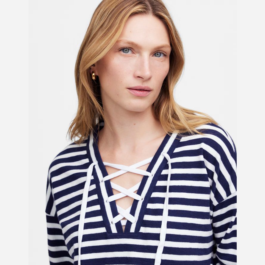 dispose d’un détail de dentelle-up et détendue manches longues. On adore le style avec le blanc denim ou un pantalon de toile.