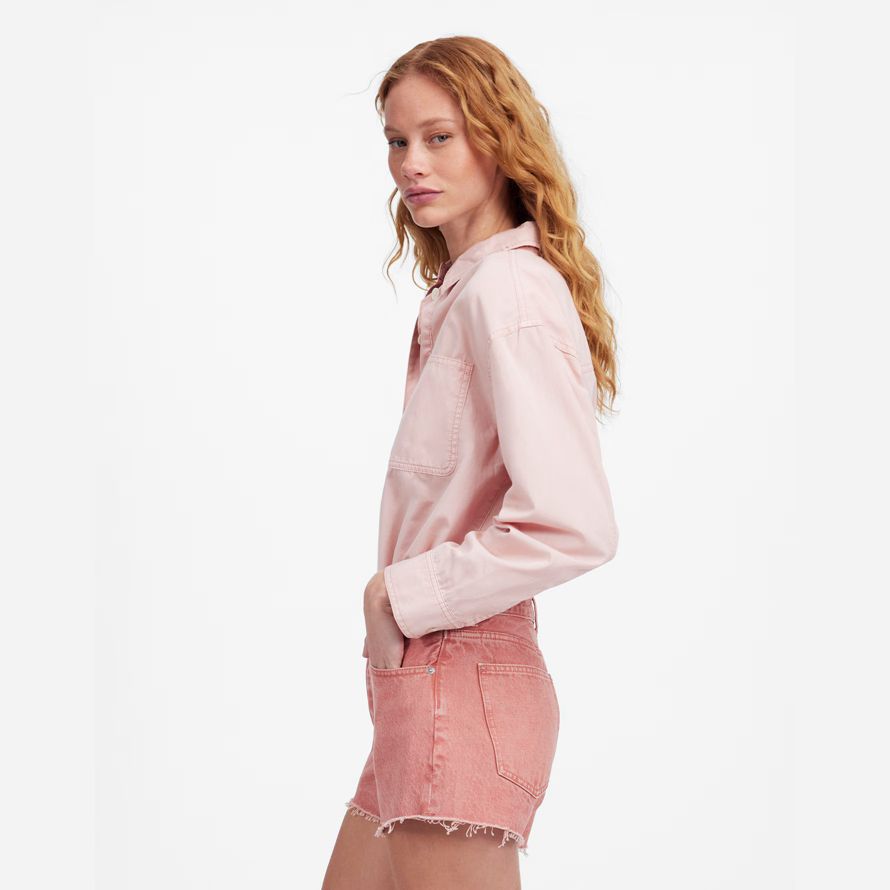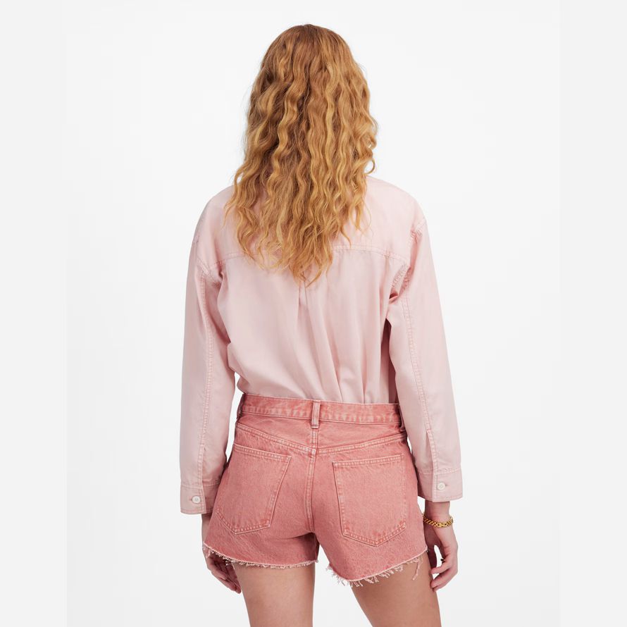 haut-lieu jean shorts disposent d’un mi-longueur de l’entrejambe et de matières de bord de l’ourlet. Teinte pour richement couleur saturée.