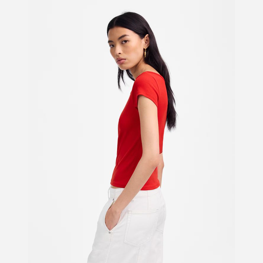 Ajustement régulier.Longueur: conçu pour frapper entre le nombril et le haut de la hanche.La longueur du corps de haut point de l’épaule: 21 1/4″.95% Regenagriᆴ certifié coton/5% élasthanne.Laver à la Machine.Importés.