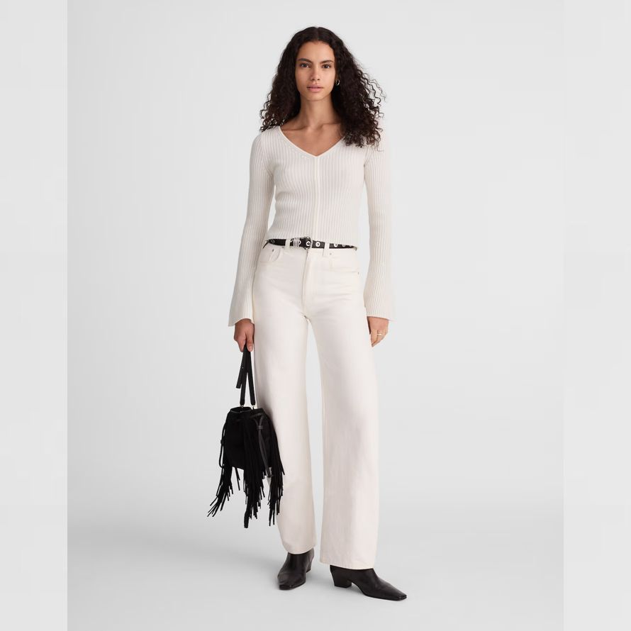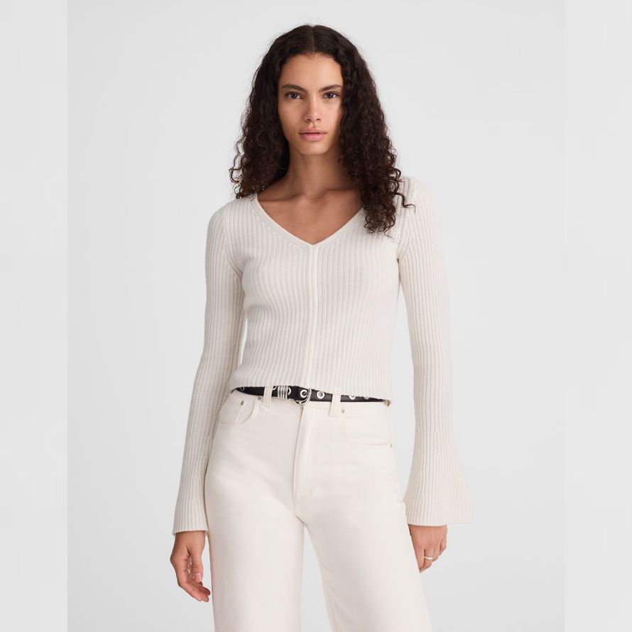 Venir en 100% laine de mérinos, ce pull côtelé haut dispose d’un profond décolleté en V et longue, évasée manches. Le flatteur slim fit le rend facile pour habiller votre favori va-out look.