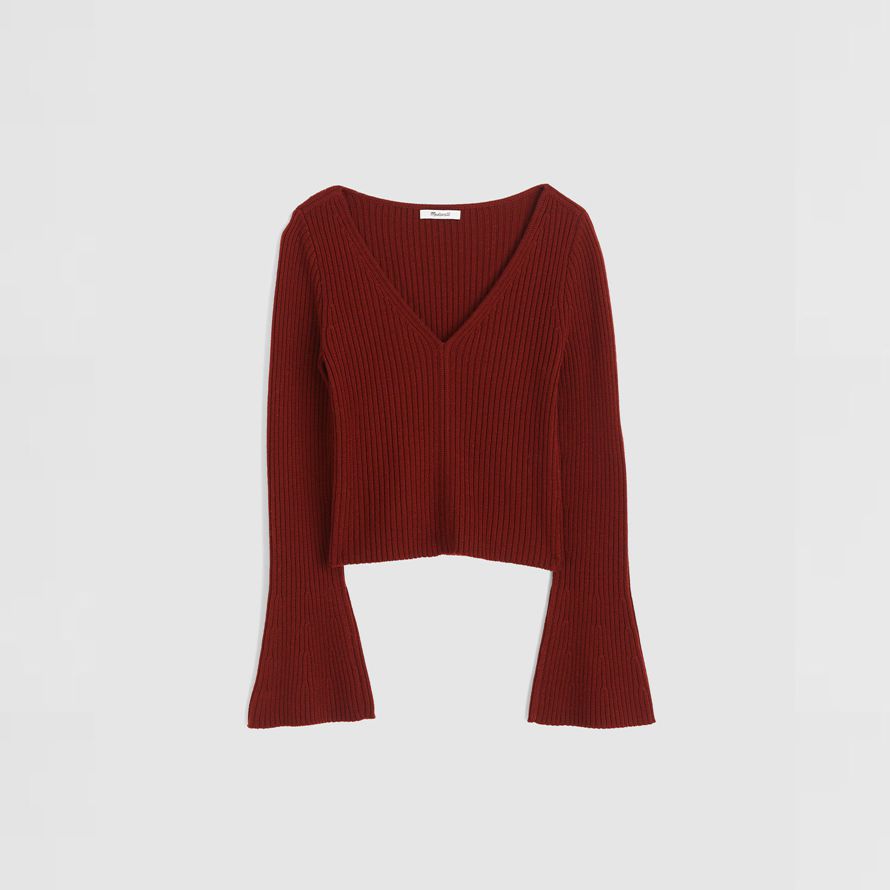 Venir en 100% laine de mérinos, ce pull côtelé haut dispose d’un profond décolleté en V et longue, évasée manches. Le flatteur slim fit le rend facile pour habiller votre favori va-out look.
