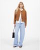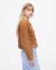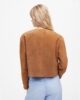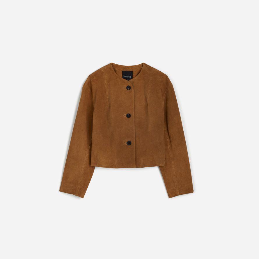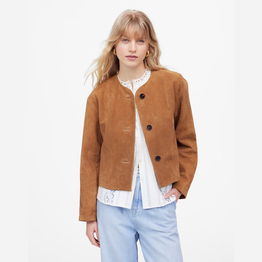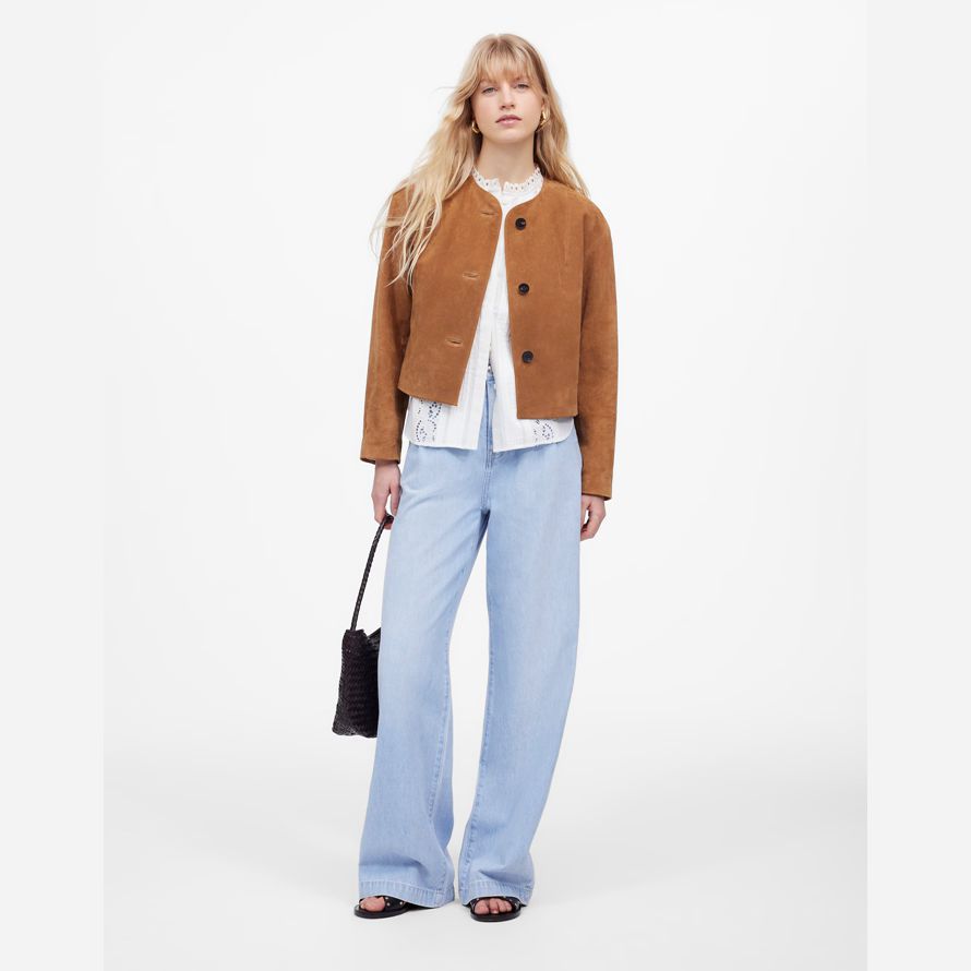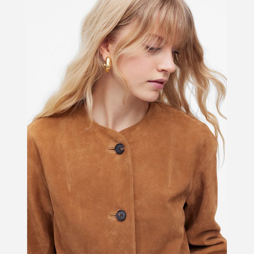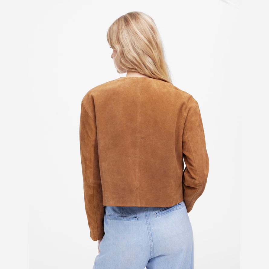 veste de luxe suede. Son recadrée, sans col design s’accorde parfaitement avec la grande-leg jeans pour un moderne, look décontracté.
