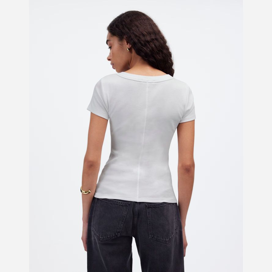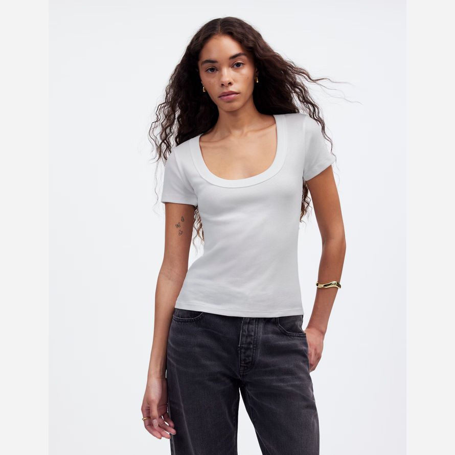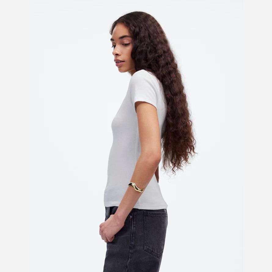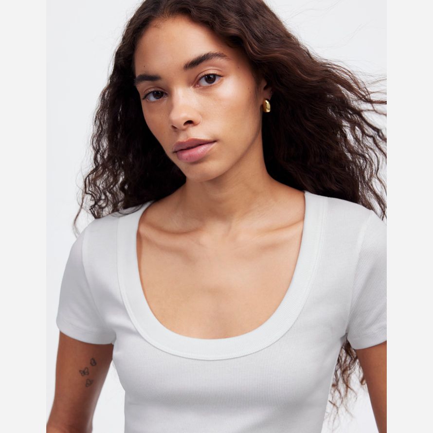 Corps de l’écumage de l’ajustement.Longueur: conçu pour frapper entre le nombril et le haut de la hanche.La longueur du corps de haut point de l’épaule: 22″.95% Regenagriᆴ certifié coton/5% élasthanne.Laver à la Machine.Importés.