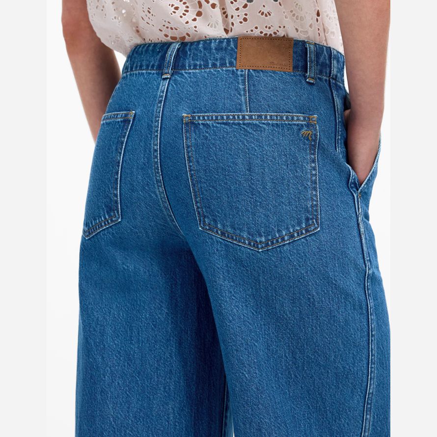 jeans ont balayant les jambes larges, plus oblique poches avant.