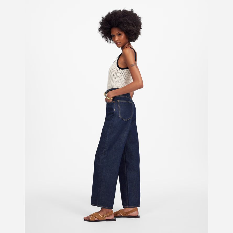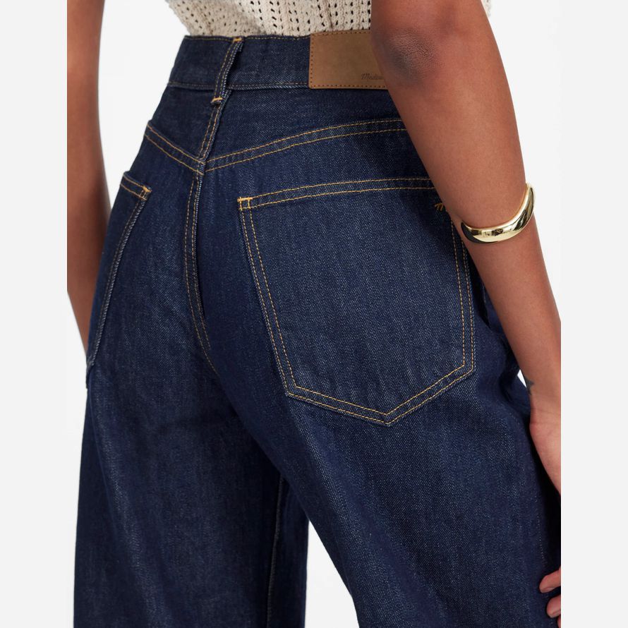 entrejambe, ces tendance jeans un haut-lieu et exagérée baril-forme de la jambe. Habiller vers le haut ou vers le bas.