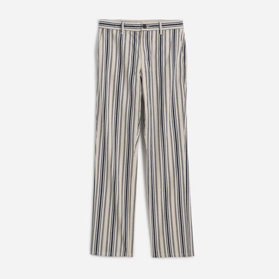 Conçue pour reposer bas sur les hanches avec inclinaison poches, une ambiance décontractée de la jambe droite et le plein-longueur entrejambe. Conçu à partir d’un coton-mélange de lin avec des fils teints des rayures et de la teinte pour plus de douceur.
