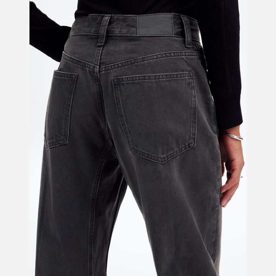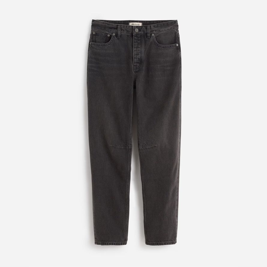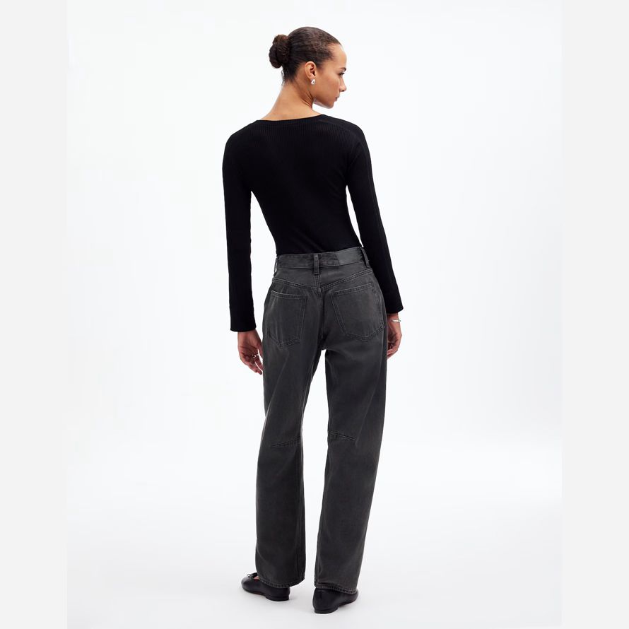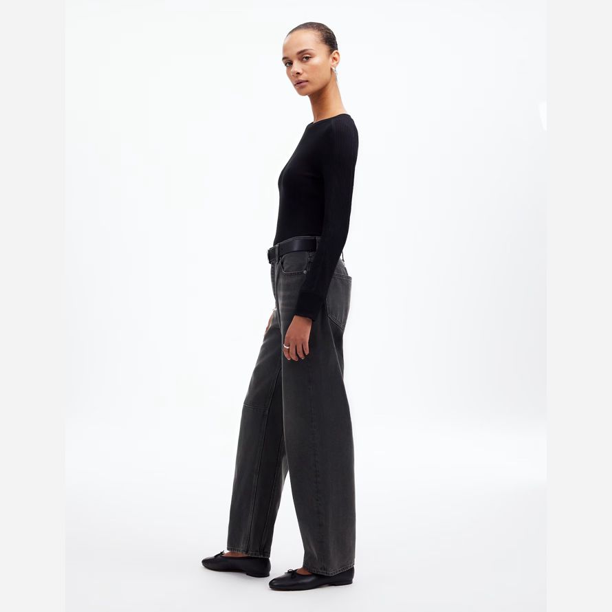 baril-leg jeans ont des fléchettes sur les genoux pour un semi-incurvée look. De Plus, si vous aimez ce style denim, de l’essayer dans nos pantalons.