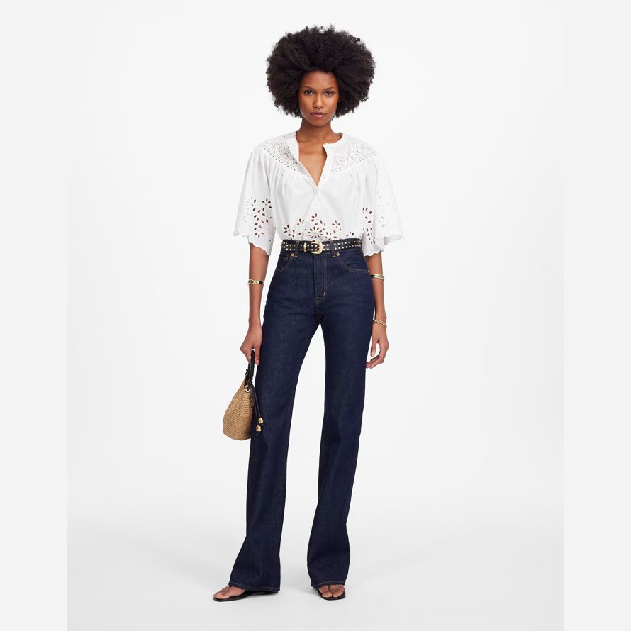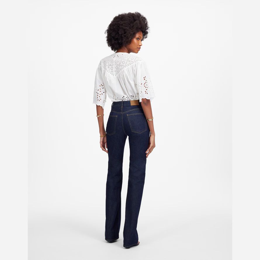 La coupe: ajustée par le biais de la hanche et du genou avec une jambe évasée.
