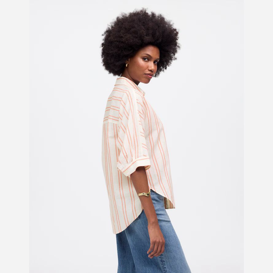 Surdimensionné en forme.Longueur de la hanche: conçu pour frapper au haut de la hanche ou au-dessous; tuckable.La longueur du corps de haut point de l’épaule: 27 1/8″.52% lin/48% coton bio.Laver à la Machine.Importés.
